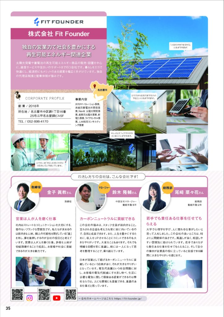 FIT FOUNDERは、「再生可能エネルギーの力で未来を創る」というビジョンのもと、太陽光・蓄電池・エコソリューション事業を展開しています。地域に根ざしながら、全国へと事業を広げていく当社の取り組みが「若い世代から見ても魅力的な会社」として評価されたことを大変光栄に思います。