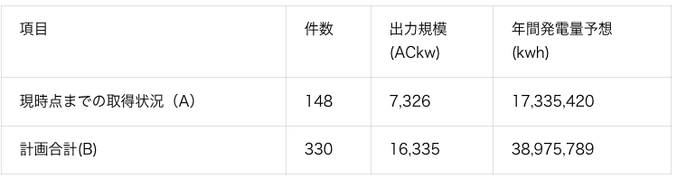 2025年5月30日時点においては148箇所(7.326MW-AC)の取得をしており建設を進めており、残り182箇所(9.009MW-AC)の取得に向けて、2025年12月末までの取得を目途に、複数の事業者に要請を行い取得を目指しております。